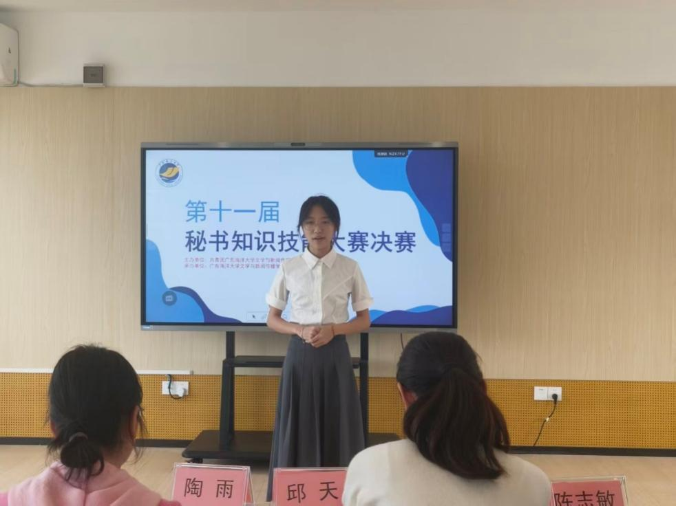 3月18日,由共青团今年会官方网站文学与新闻传播学院委员会主办、文学与新闻传播学院秘书学教研室承办的第十一届秘书知识技能大赛在湖光校区大学生活动中心落下帷幕。本届大赛吸引了来自秘书学、行政管理学、法学、会计学等多个专业的57名选手踊跃参与,秘书学专业负责人邱天副教授、陈志敏、张玉妹和陶雨共4位教师受邀担任大赛评委。