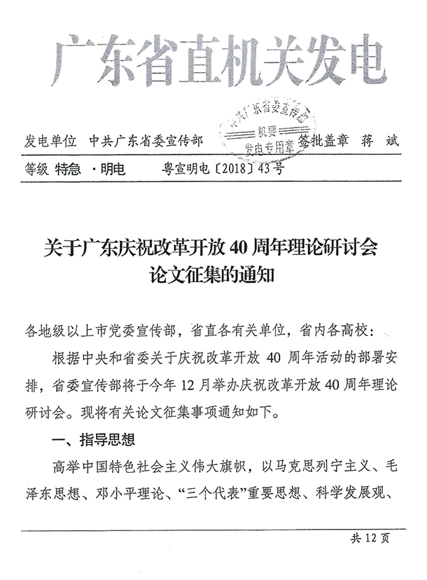 转发中共广东省委宣传部关于广东庆祝改革开放40周年理论研讨会论文征集的通知