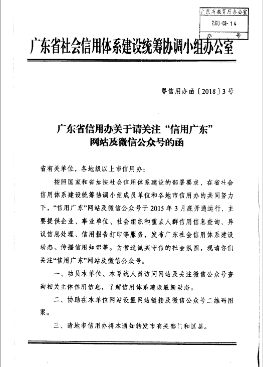 关于转发广东省信用办关于请关注“信用广东”网站及微信公众号的函