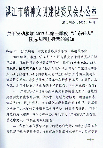 转发《关于发动参加2017年第三季度“广东好人”候选人网上投票》的通知
