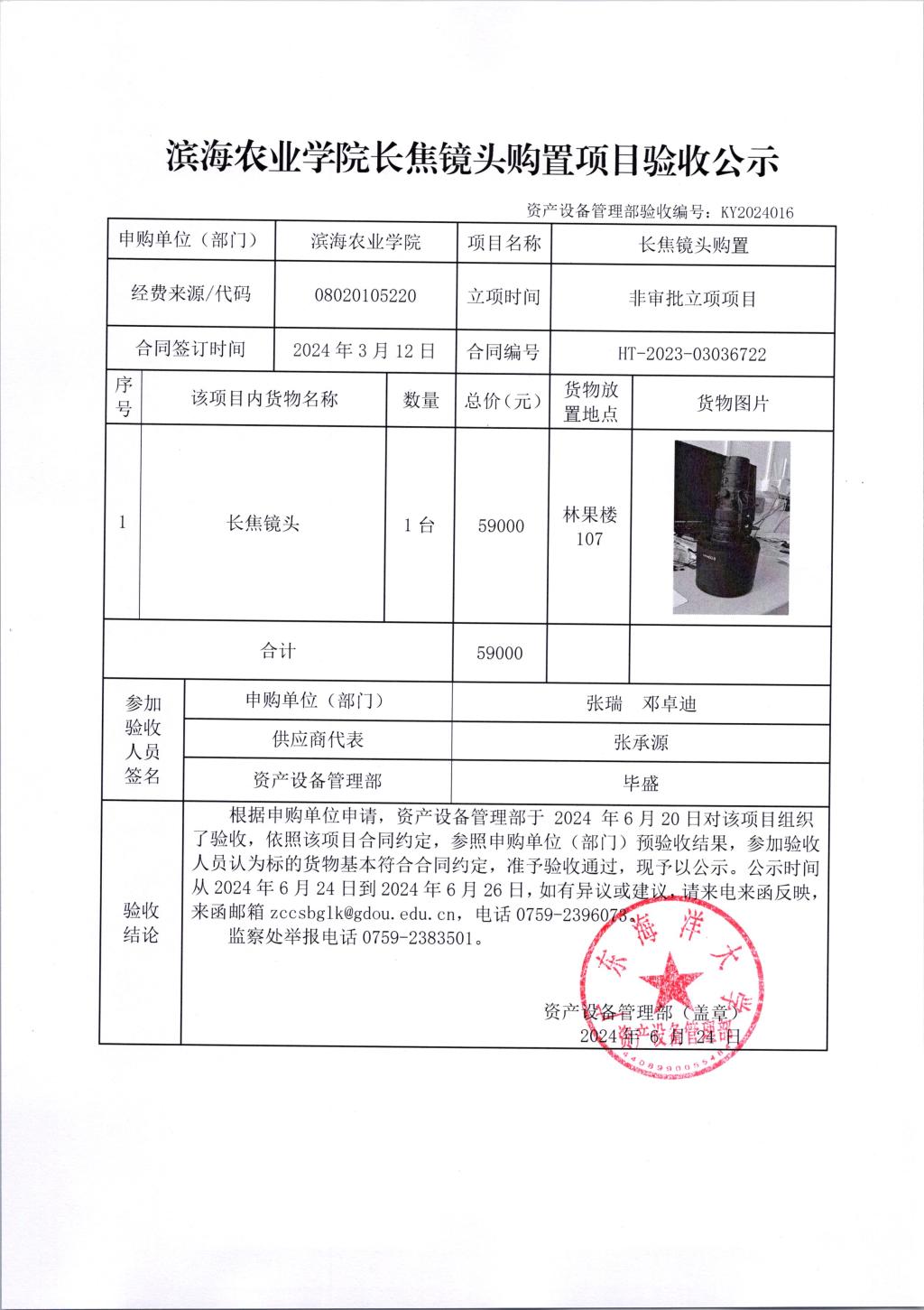 滨海农业学院长焦镜头购置项目验收公示