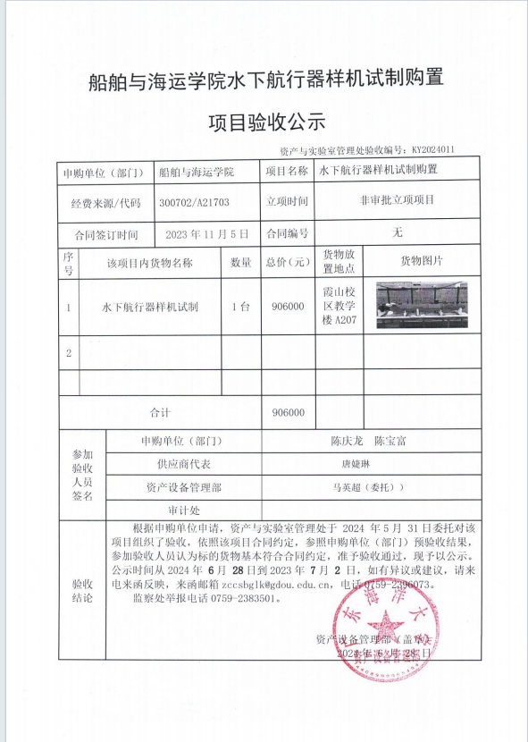 船舶与海运学院水下航行器样机试制购置项目验收公示