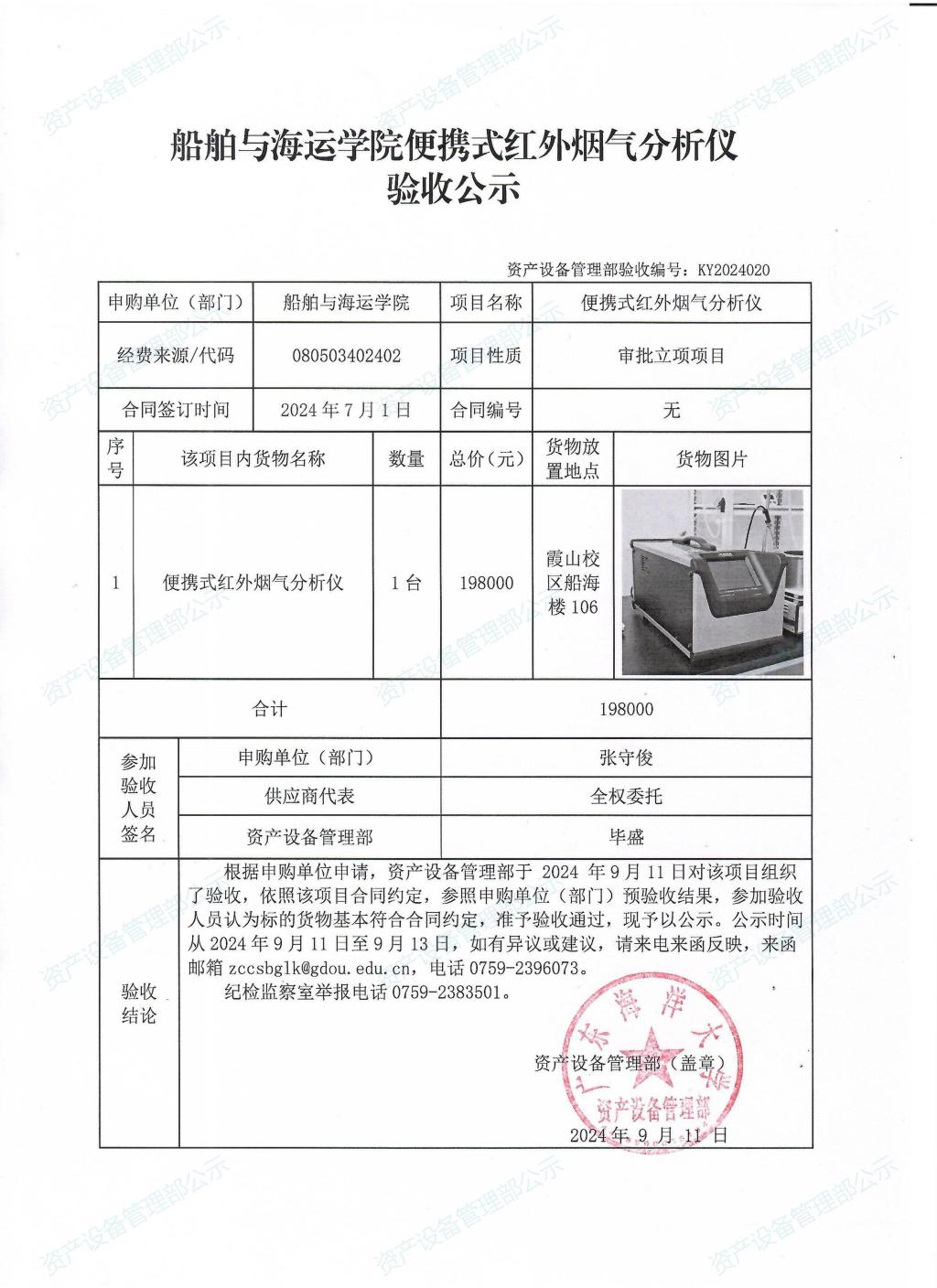 船舶与海运学院便携式红外烟气分析仪验收公示