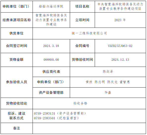 船舶与海运学院中央智慧海洋牧场装备及动力装置专业教学条件建设项目已验收,现将验收结果公示,公示时间:2024年12月14日至12月16日。