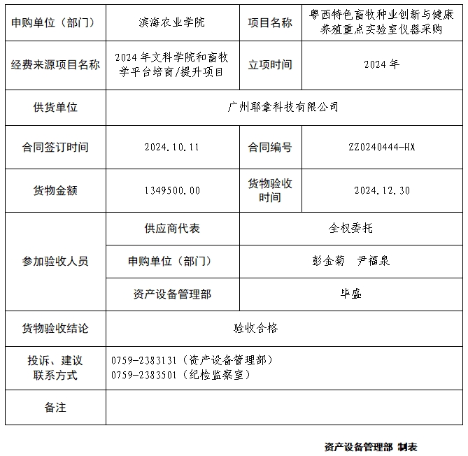 滨海农业学院粤西特色畜牧种业创新与健康养殖重点实验室仪器采购已验收,现将验收结果公示,公示时间:2024年12月30日至2025年1月2日。