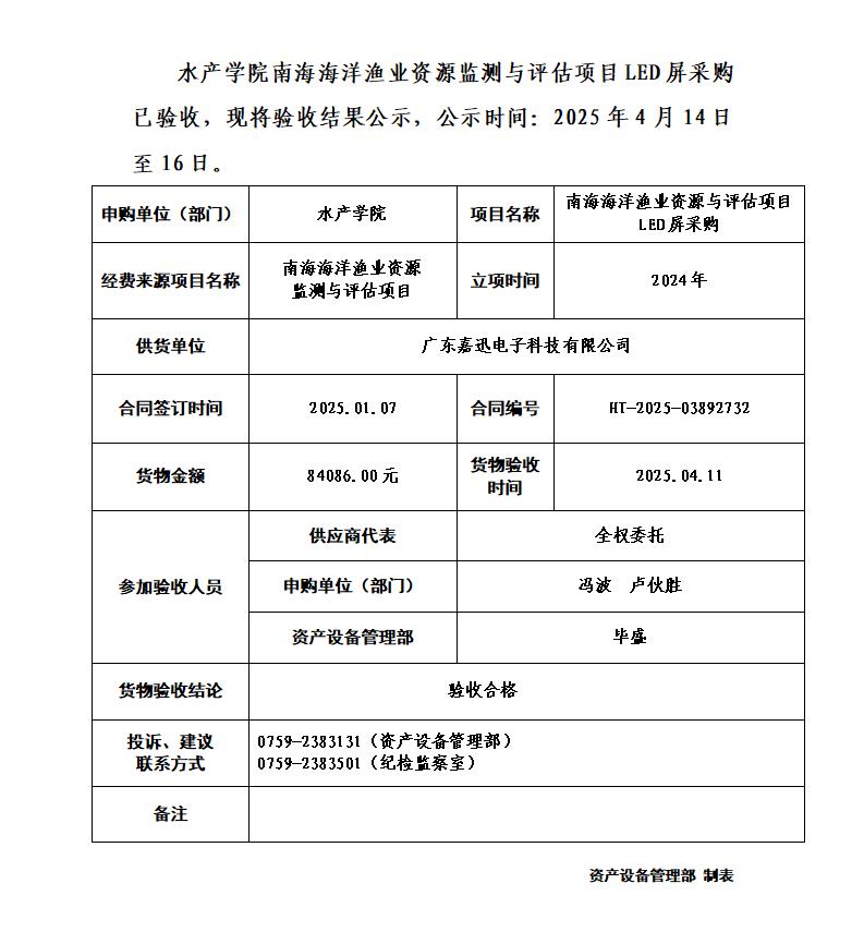 水产学院南海海洋渔业资源监测与评估项目LED屏采购验收公示