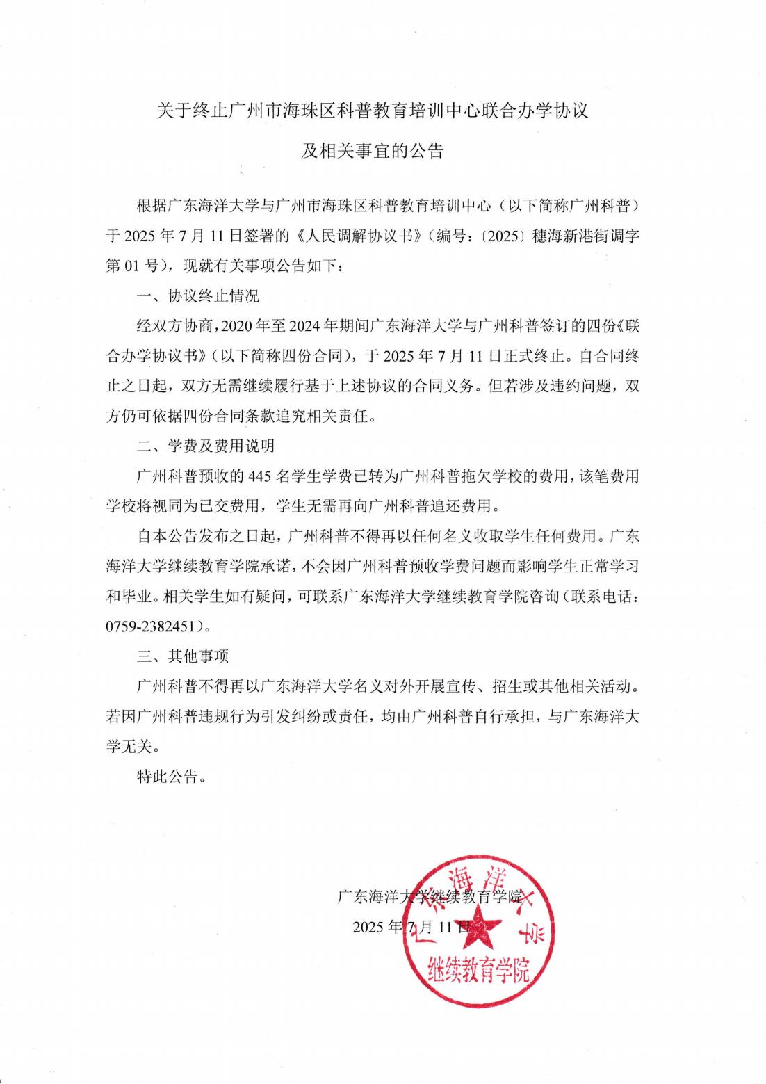 关于终止广州市海珠区科普教育培训中心联合办学协议及相关事宜的公告