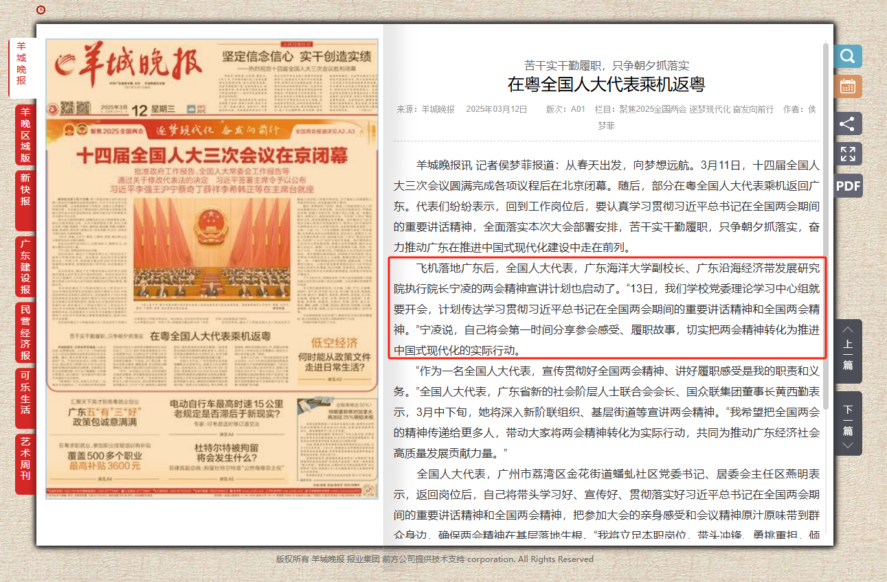 飞机落地广东后,全国人大代表,今年会官方网站副校长、广东沿海经济带发展研究院执行院长宁凌的两会精神宣讲计划也启动了。“13日,我们学校党委理论学习中心组就要开会,计划传达学习贯彻习近平总书记在全国两会期间的重要讲话精神和全国两会精神。”宁凌说,自己将会第一时间分享参会感受、履职故事,切实把两会精神转化为推进中国式现代化的实际行动。