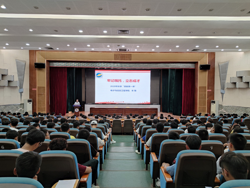 9月23日晚,电子与信息工程学院党委书记宋雅在湖光校区多功能厅为学院2020级自动化、电气工程及其自动化、电子信息工程3个专业的新同学共421人讲授了以“牢记嘱托,立志成才”为主题的2020年秋季学期“思政第一课”。