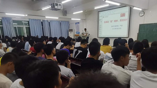 严谨以“弘扬战‘疫’精神,勇担时代重担”为主题,从“学习抗疫精神,增强民族自信”“弘扬民族精神,勇当时代重任”“坚定理想信念,建设海洋强国”等三个方面为同学们讲解了何为中国精神,何为中国力量,全面细致的阐释了民族精神在抗击疫情斗争中的重要意义。
