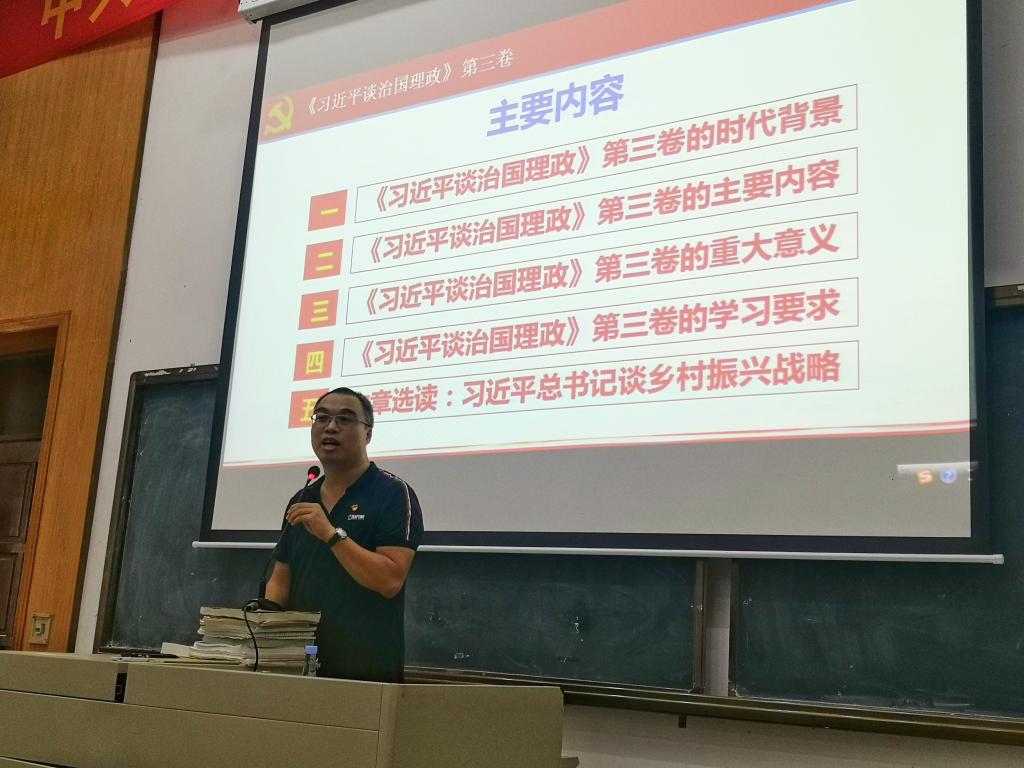 10月14日下午,滨海农业学院组织全体教职工在兴农楼109室召开《习近平谈治国理政》第三卷集中学习宣讲报告会。宣讲报告会由学校党委理论宣讲团李林杰博士主讲,学院党委书记邓伟强主持报告会。