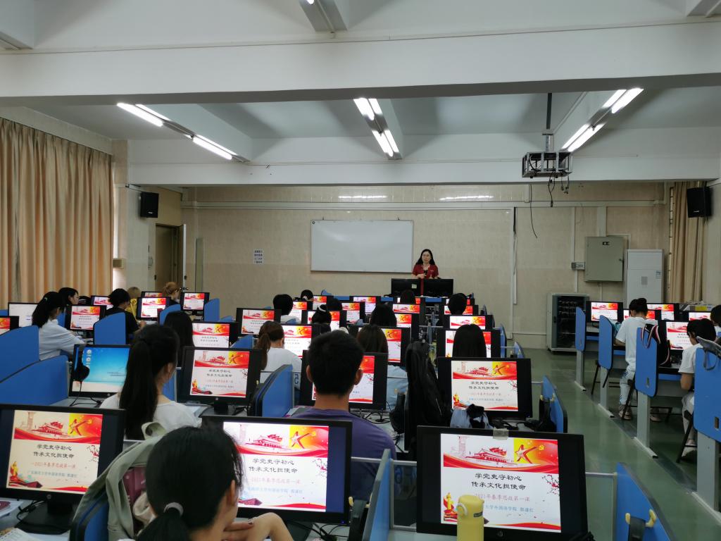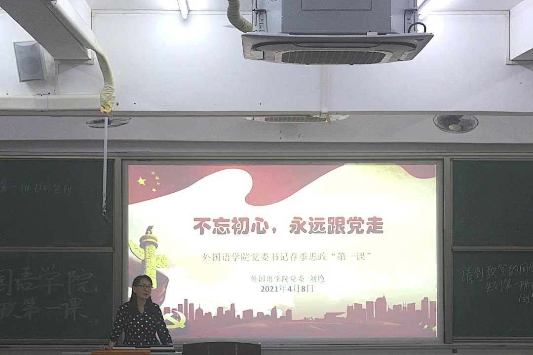 4月8日晚上,外国语学院正处级辅导员、党委副书记刘艳在钟海楼04024为学院2019级学生讲授了题为《不忘初心,永远跟党走》的“思政第一课”。课程紧紧围绕习近平新时代中国特色社会主义思想,引导广大青年学生正确了解党史、国史,增强“四个意识”,坚定“四个自信”,做到“两个维护”,自觉担负起新时代的青年使命,为实现“两个一百年”奋斗目标、实现中华民族伟大复兴中国梦而努力奋斗。