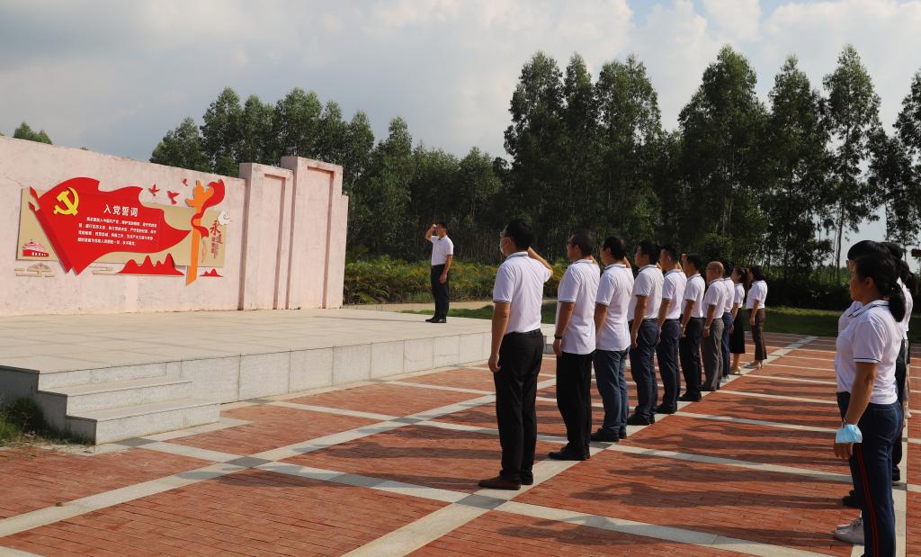 “我志愿加入中国共产党……”在遂溪西南地区革命史馆广场上,支部书记尹喜带领全体党员面对鲜红的党旗,紧握右拳,重温入党誓词。铿锵誓言响彻广场,激励着在场每一位党员在学思践悟中坚定理想信念,在奋发有为中践行初心使命。
