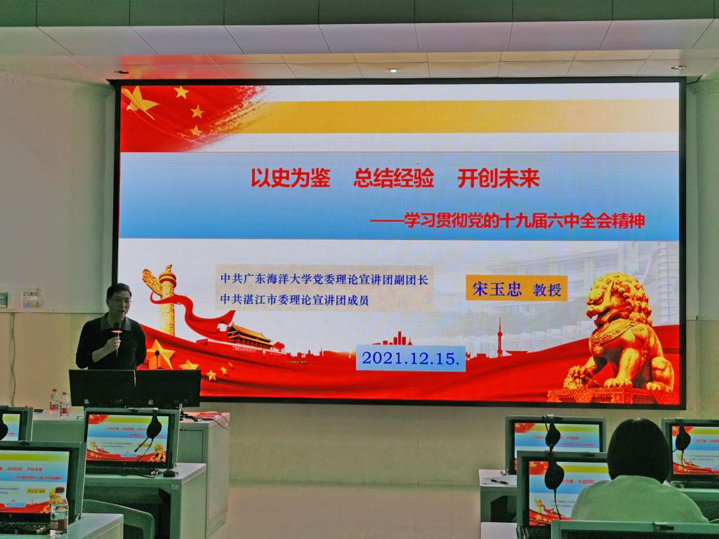 12月22日下午,外国语学院党委在湖光校区兴教楼110室举行学习贯彻党的十九届六中全会精神宣讲报告会,学校党委理论宣讲团成员宋玉忠教授作宣讲报告,学院全体教职工和学生党员参加报告会。会议由学院正处级辅导员、党委副书记刘艳主持。