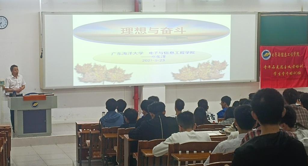 3月23日晚,电子与信息工程学院院长付东洋在湖光校区二教B5201讲授“思政第一课”,学院团学骨干、青马班学员共计180人参加了学习。