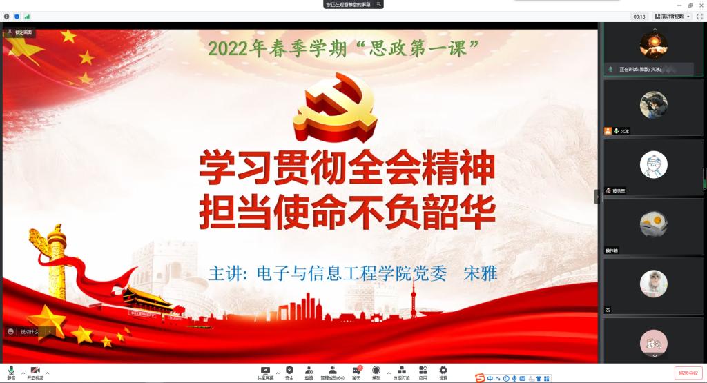 3月22日上午,电子与信息工程学院党委书记宋雅在线上为学院70余名研究生讲授了题为“学习贯彻全会精神 担当使命不负韶华”的2022年春季学期“思政第一课”。