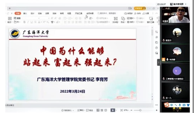 按照学校党委部署,管理学院党委书记、院长于3月9日和3月24日线上开讲2022年春季学期 “思政第一课”,教育引导青年学生通过党的百年奋斗史,进一步加深对党初心使命的理解和认识,坚持德智体美劳全面发展,努力成长为堪担大任的新时代栋梁之才。共有580多名学生党员、预备党员、入党积极分子和研究生、本科生在线上课。