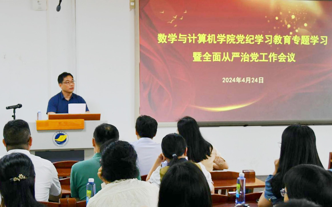 根据党纪学习教育工作部署,4月24日下午,数学与计算机学院在明德楼A103报告厅召开党纪学习教育专题学习暨2024年全面从严治党工作会议。学院全体领导干部、教师党员参加学习,学院党委书记龙俊以《学纪知纪明纪守纪》为题作专题报告。