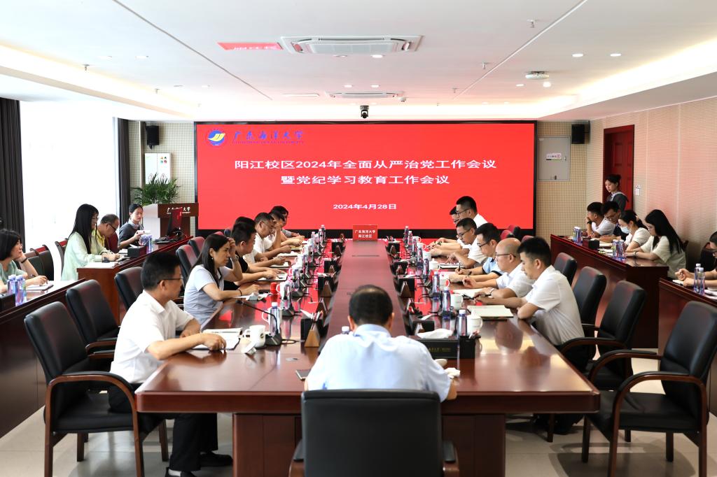 4月28日下午,阳江校区在海纳楼712室召开2024年全面从严治党暨党纪学习教育工作会议,传达学校2024年全面从严治党工作会议精神,部署校区全面从严治党和党纪学习教育工作。学校党委常委、副校长、阳江校区管理办公室主任周昌仕出席会议并讲话。校区党委副书记丁永成主持会议。校区领导、各学院党总支书记、各职能部门负责人以及校区机关党支部全体党员干部参加会议。
