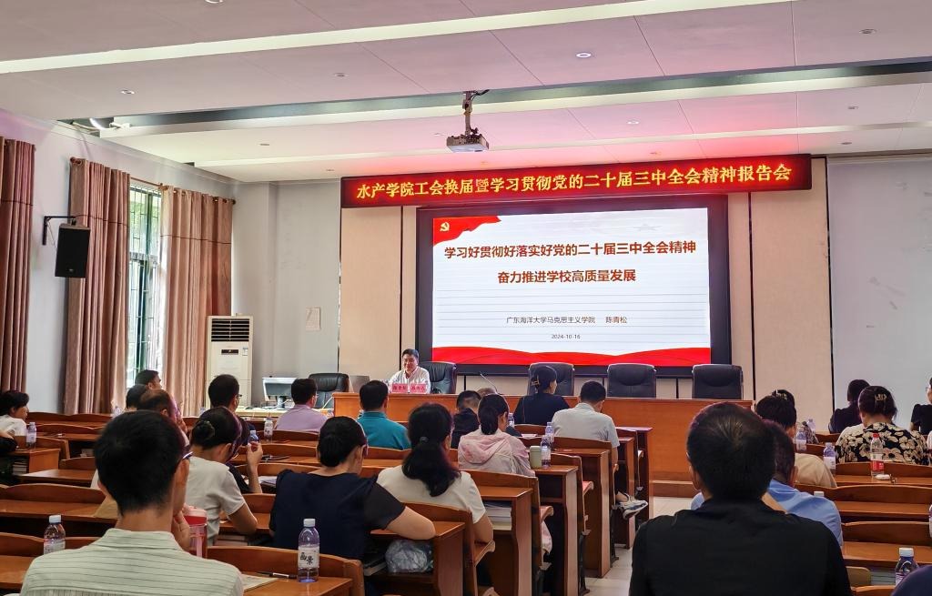 10月16日,水产学院在水产楼109教室召开了学习贯彻党的二十届三中全会精神报告会,学校党委理论宣讲团成员、马克思主义学院党委书记陈青松作宣讲报告。会议由学院党委书记王海燕主持。