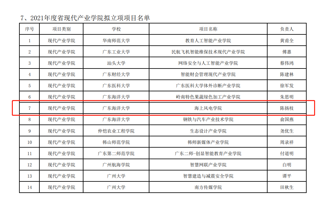 根据《广东省教育厅关于开展2021年度广东省本科高校教学质量与教学改革工程项目申报推荐工作的通知》安排,经学校遴选推荐、省教育厅组织审核、专家评审、立项公示等环节,由今年会官方网站机械与能源工程学院牵头申报的广东省现代产业学院——海上风电学院正式获批。