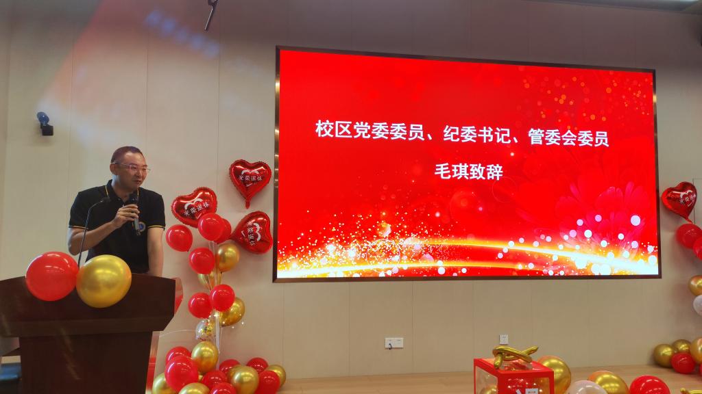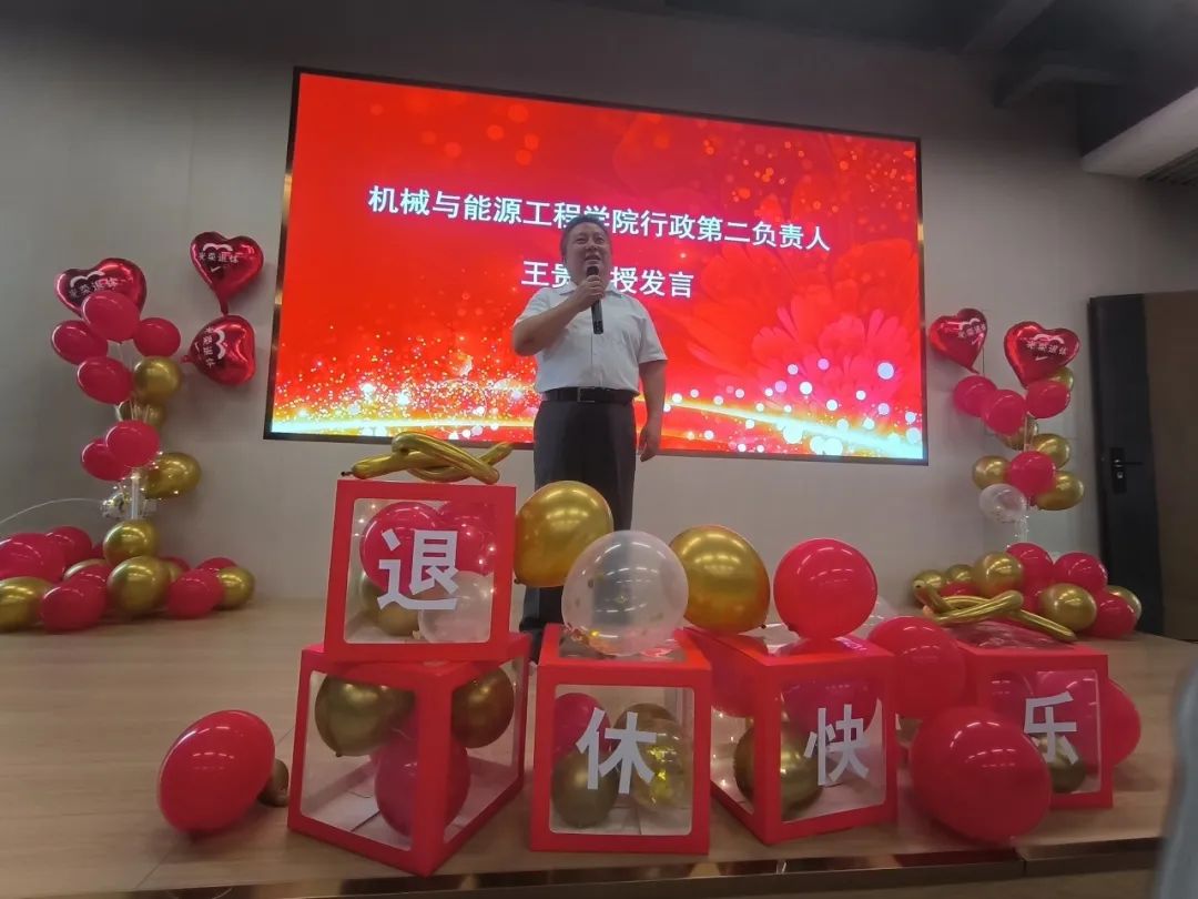 荣休仪式分为三个环节,分别为忆往昔岁月、颂今朝奉献以及送美好祝福。在这个特殊而庄重的仪式上,校区领导和机械与能源工程学院师生们齐聚一堂,见证王贵教授迈入人生新的篇章,荣休于这个充满记忆和情感的校区。在仪式上,王贵教授回顾了自己的职业生涯并表达了对国家和学校的感恩,毛琪代表校区致辞并为王贵教授戴上绶带,夏杏洲代表校区颁发纪念杯,陈扬枝代表学院颁发表彰牌匾并深情献唱一曲送别,学生代表献上深情朗诵,机械与能源工程学院全体教师通过视频献上祝福,仪式现场温馨而热烈。