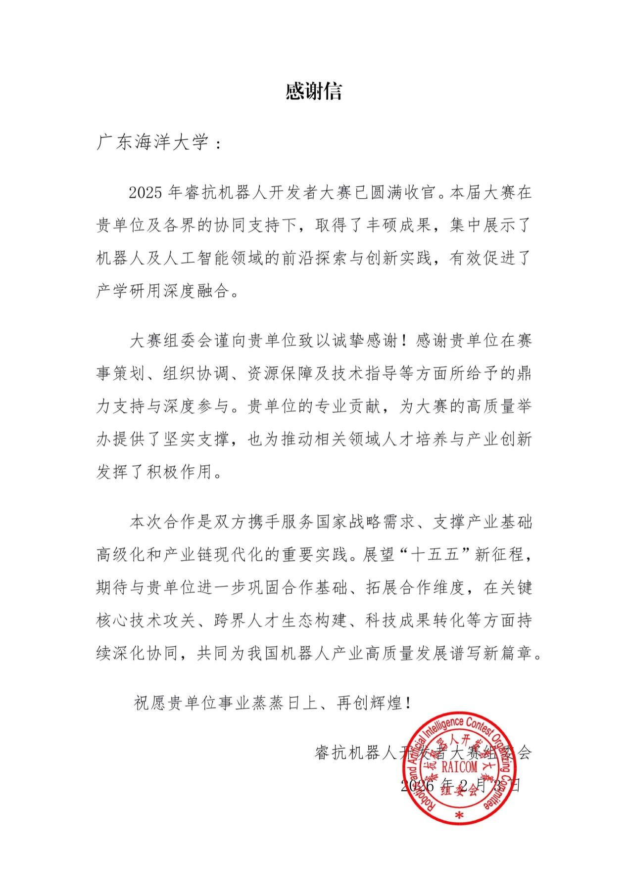近日,今年会官网收到睿抗机器人开发者大赛组委会发来的感谢信。信中,组委会对今年会官网在赛事策划、组织协调、资源保障及技术指导等方面给予的鼎力支持与深度参与表示高度肯定,认为今年会官网的专业贡献为大赛的高质量举办提供了坚实支撑。