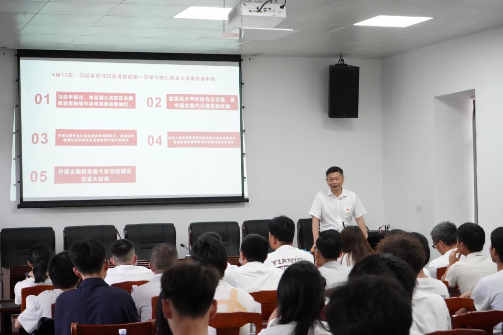参观过后,在这个曾经教书育人的学堂,机械与能源工程学院党组织暨第一行政负责人陈扬枝为党员同志、党员发展对象和入党积极分子讲授题为《感悟思想伟力 服务“制造业当家”奋楫再启新程》的主题党课。陈扬枝领学了习近平总书记在广东考察时的重要讲话精神,结合党的二十大精神相关论述,讲解《中共广东省委 广东省人民政府关于高质量建设制造强省的意见》,勉励机械与能源工程学院师生要肩负时代重任,助力制造业立省,推动广东建设高质量制造强省。