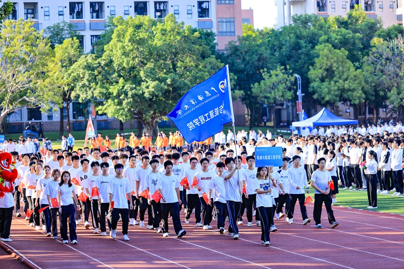 伴随着激昂的运动员进行曲,机械与能源工程学院的师生们身着统一的服装,精神抖擞地步入会场。机能学院的口号“青春飞扬,机能最强”响彻校区云霄,充分展现了学院师生的团结与活力,彰显着勇争佳绩的信心,引发观众席的热烈掌声。
