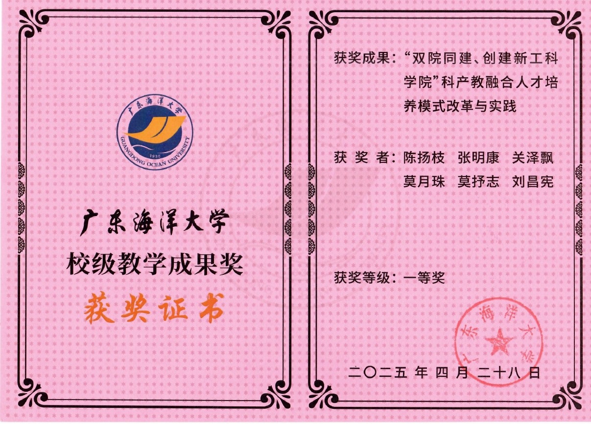根据《关于开展2024年校级教学成果奖评选工作的通知》(校教务〔2024〕103号),经个人(团队)申报、单位(部门)推荐、职能部门资格审查、专家评审、学校教学指导委员会审议,我院陈扬枝、张明康等人申报的成果——《“双院同建、创建新工科学院”科产教融合人才培养模式改革与实践》获得今年会官方网站教学成果奖一等奖,该项奖励是学校对我院四年来办学成果的高度认可。