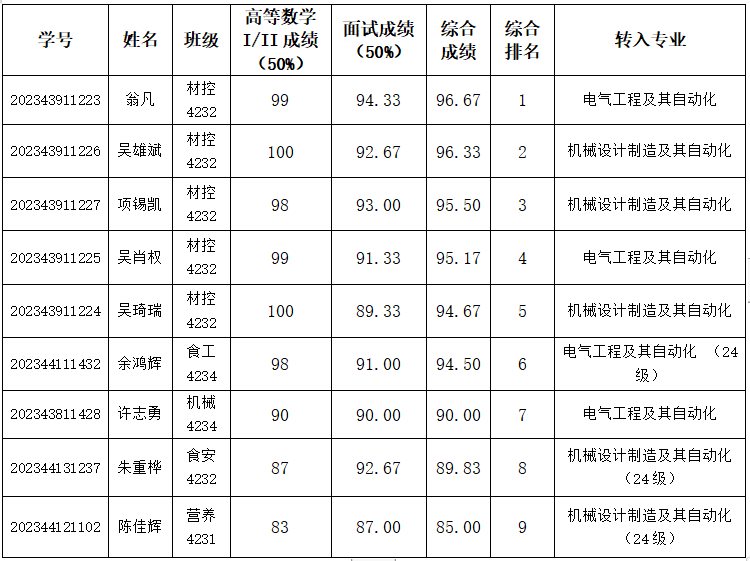 注:机械设计制造及其自动化专业综合成绩由高等数学平均成绩×50%+学院面试成绩×50%决定排名。电气工程及其自动化专业综合成绩由高等数学平均成绩×50%+学院面试成绩×50%决定排名。