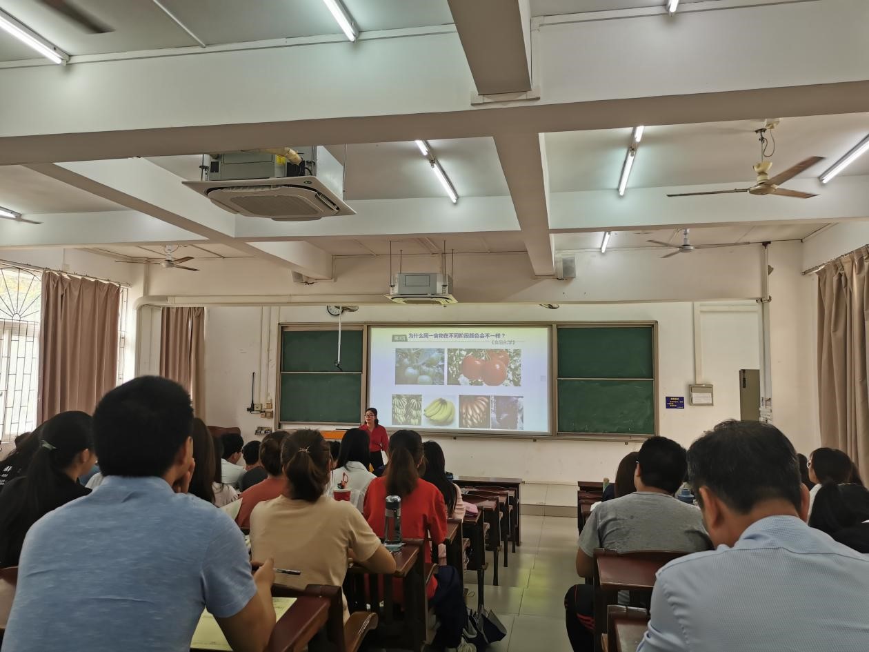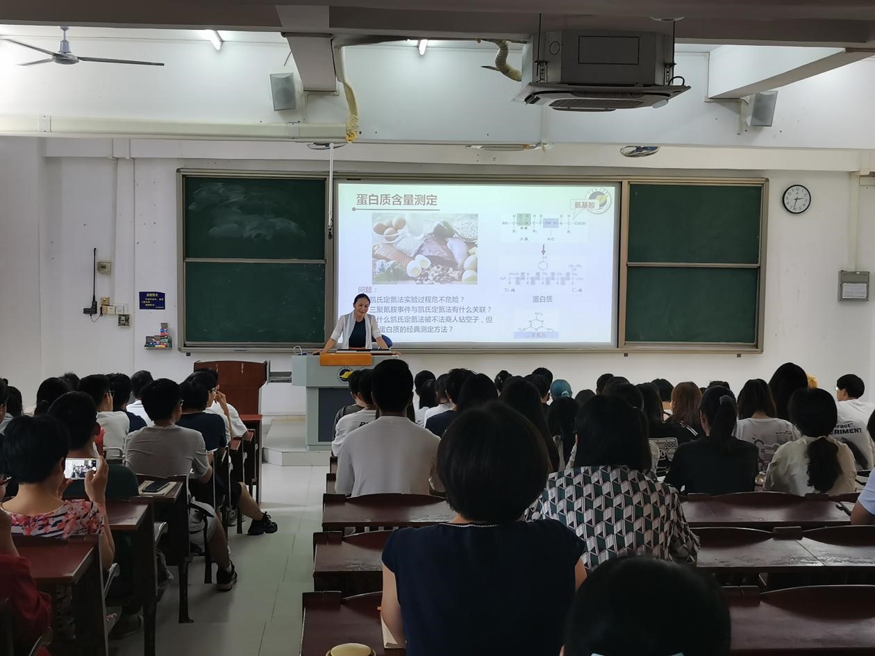 林华娟博士讲授了《食品分析》中的“蛋白质含量测定”内容。蛋白质测定方法原理多,内容复杂,具有知识碎片化特征。林华娟博士以实验项目为切入点,用任务驱动学习,以分析和解决问题为导向,有效组织学生开展项目汇报、提问互动和单元知识回顾与总结等教学活动。以学生为主体,以实践应用为主线,充分利用线上、实验和课堂等三大育人阵营,深度融入立德树人元素,充分发挥教师的主导作用,有力打破学生存在的“实验报告=预习报告+实验结果”思维定势,取得了良好的教学效果。