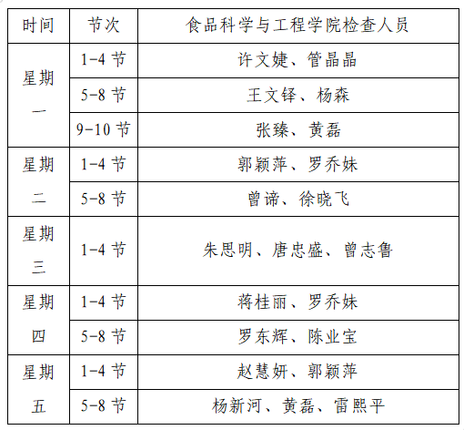 负责检查本学院师生第一周(9月2日至9月6日)的课堂情况,对本学院教师所承担的所有教学课程和所有学生班级进行全覆盖检查,不留盲点。具体安排如下: