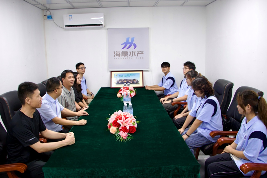 团队跟随着叶岳霖先生走进海象水产,叶岳霖先生为我们详细介绍了海象水产的基本情况。海象水产是一家集水产养殖、加工、销售于一体的综合性公司,养殖基地位于阳江市江城区埠场镇山外西村委会南海围,现有海水养殖面积1600亩。