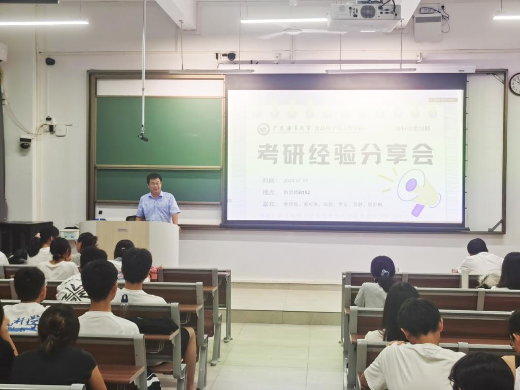 为加深学院学生对考研的了解,明确考研目标,掌握科学的备考策略,7月1日晚,我院于慎思楼B102举办了考研经验分享专题交流会,本次会议共邀请了食品科技学院6名成功考取硕士研究生的2024届毕业生为同学们分享宝贵的考研经验。食品科学与工程学院党总支书记夏杏洲、副院长杨新河、辅导员黄磊、辅导员郭颖萍出席本次会议。学院三个年级学生积极参会,到会人数近百人。