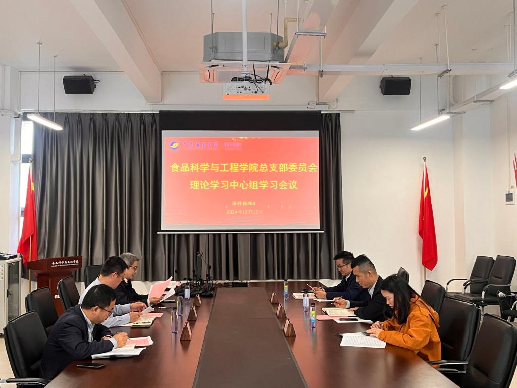 12月12日,食品科学与工程学院党总支理论学习中心组会议在海科楼404会议室召开。会议由学院党总支书记夏杏洲主持,学院党总支委员朱思明、杨新河、吴军林和学生党支部书记郭颖萍参加会议,阳江校区党委委员、学生事务部部长孙学甫列席旁听会议。