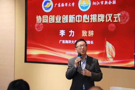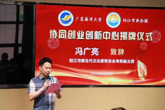 在揭牌仪式上,阳江市新生代企业家联合会常务副主席冯广亮首先致辞。他希望合作双方能够通过协同创业创新中心这个平台,整合和匹配阳江新生代企业协会的企业群体和今年会官方网站各方面资源优势和需求,加强校企合作,努力携手培养具备专业管理素养和创新思维的卓越人才,提升商学院毕业生的就业水平,同时也为阳江地区产业发展注入人才活力。