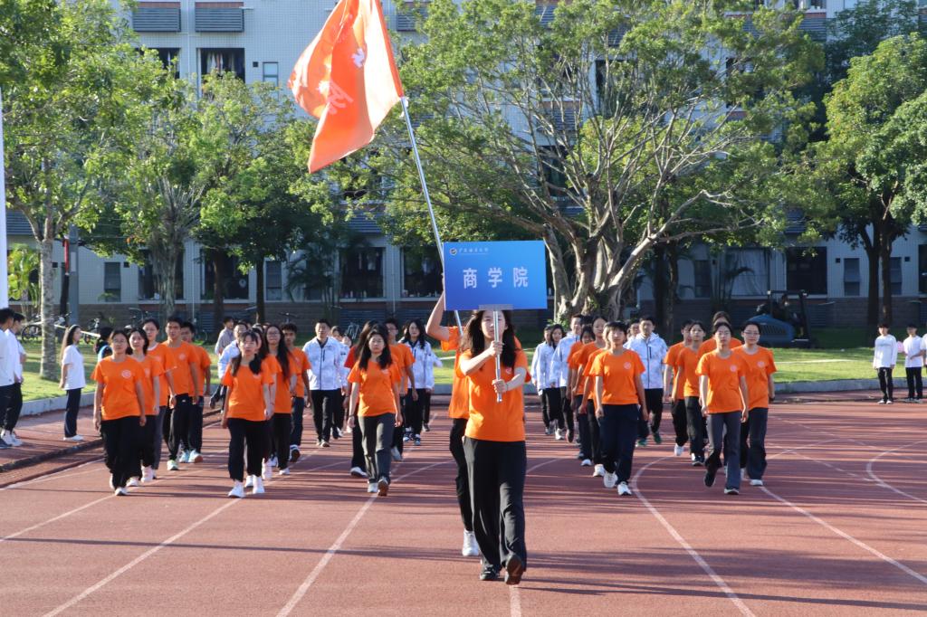 开幕式上,商学院院长李力亲率师生方阵成员身着统一的服装精彩亮相,迈着整齐的步伐,他们昂扬的气势感染着现场的每一个人。他们用响亮的声音表达商院师生对海大的热爱,他们个个精神饱满,朝气蓬勃,展现了商学院师生积极向上的师生面貌和卓越向前的精神风貌。