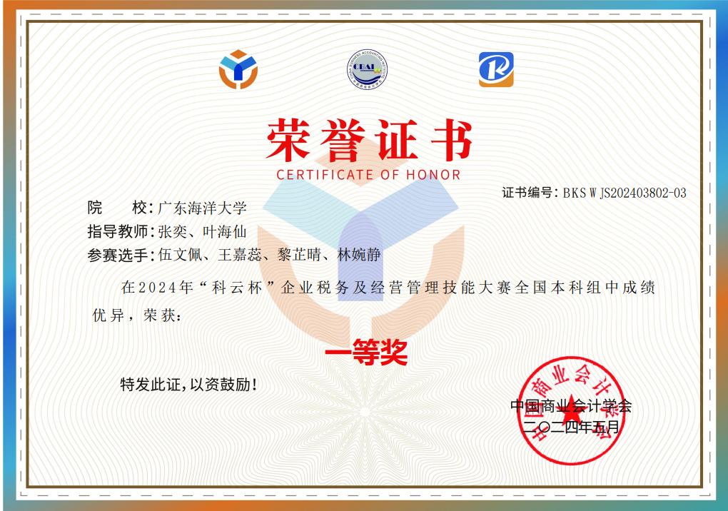 5月25日,由中国商业会计学会主办的2024年“科云杯”企业税务及经营管理技能大赛成功举办,来自全国31个省、自治区、直辖市的800多支队伍参加了比赛,由今年会官网商学院会计学专业张奕、叶海仙老师指导的两支团队在此次本科组比赛中荣获奖项,其中:商学院2022级会计专业伍文佩、王嘉蕊、黎芷晴、林婉静四位同学位列广东省第2名全国第9名,荣获“全国十强”、一等奖;黄志鸿、陈雯莉、徐雅琪、黄钰珊四位同学位列广东省第8名喜获二等奖。