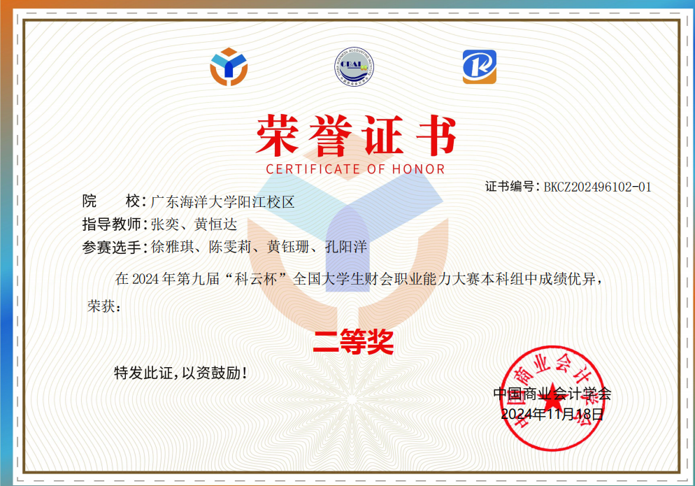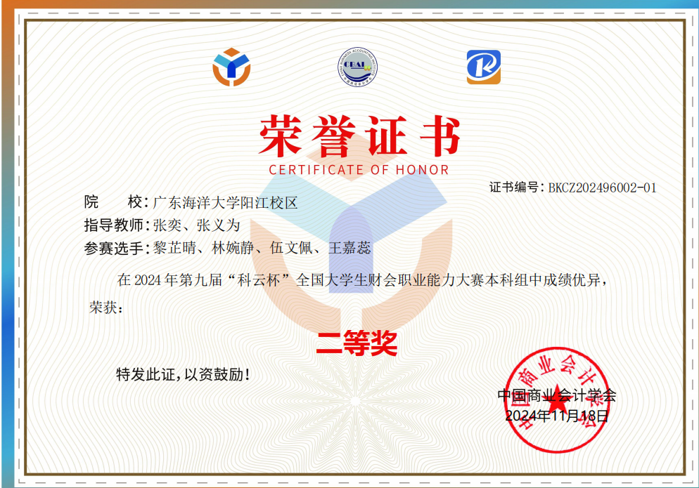 近日,由中国商业会计学会主办的2024年第九届“科云杯”全国大学生财会职业能力大赛本科组比赛成功举办。在来自全国548所本科院校的1045支队伍的激烈竞争中,商学院张奕、张义为和黄恒达老师指导的两支代表队表现突出,展现了卓越的团队协作精神、严密的逻辑思维和灵活的问题解决能力。商学院两支代表队均荣获二等奖。
