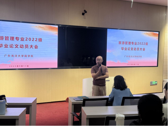 2025年9月11日下午,商学院旅游管理专业成功举办了2022级本科生毕业论文动员大会。商学院旅游管理专业教研室主任隆斐、资深教授李践尧,以及论文指导老师白卫静、骆彦君出席了本次会议,为学生们提供了一场及时且全面的指导。