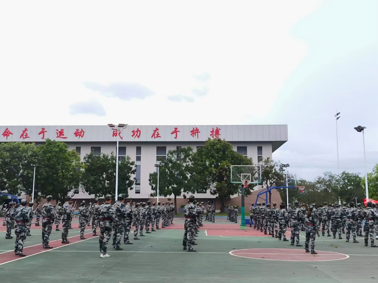 接下来的14天,在承训部队教官的严格指导与耐心带教下,一场场紧张有序的训练在训练场铺展开来。这不仅是军事技能的锤炼,更是意志与担当的磨砺。从晨光熹微时的站军姿开始,到正午烈日下的方阵训练,再到暮色中的战术演练,每个动作都力求标准,无论多么辛苦也没人喊放弃。九月的广东天气无常,烈日常把迷彩服浸出层层盐渍,骤雨又会瞬间浇透衣背,学子们抹一把脸上的水——分不清是汗水还是雨水,依然咬牙跟上训练节奏。更难忘台风过境前夕,狂风卷着乌云压向操场,教官临时调整训练方案,学子们挤在雨棚下,反复揣摩队列动作要领。承训教官看着浑身湿透却眼神发亮的学子,忍不住感慨“这股韧劲,不输军人!”正是这样的坚持,让5营学子一步步掌握了站军姿、走方阵、战术演练等各项军事技能,也让“坚韧不拔”成了这段时光最鲜明的注脚。