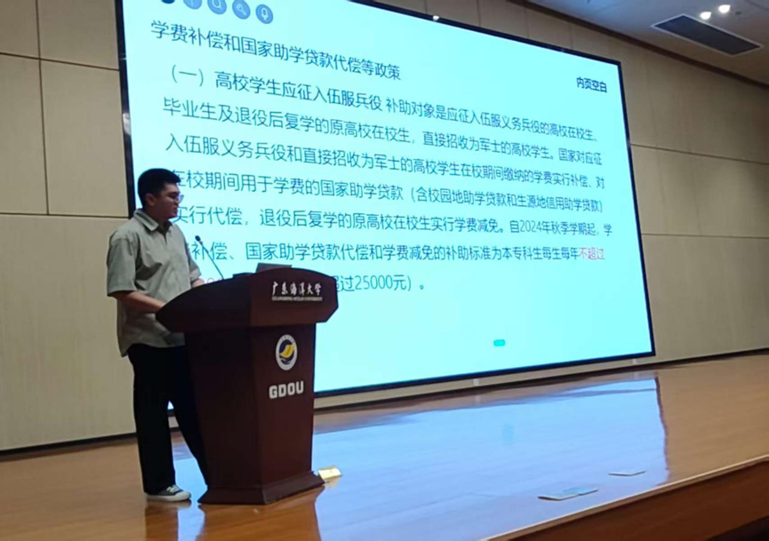 在国家资助政策宣传环节,商学院辅导员司徒权锋老师从绿色通道、资助范围、国家奖学金、各项助学及奖学金的资助等方面,全面讲解专项资助政策,让新生了解各种资助政策优势。