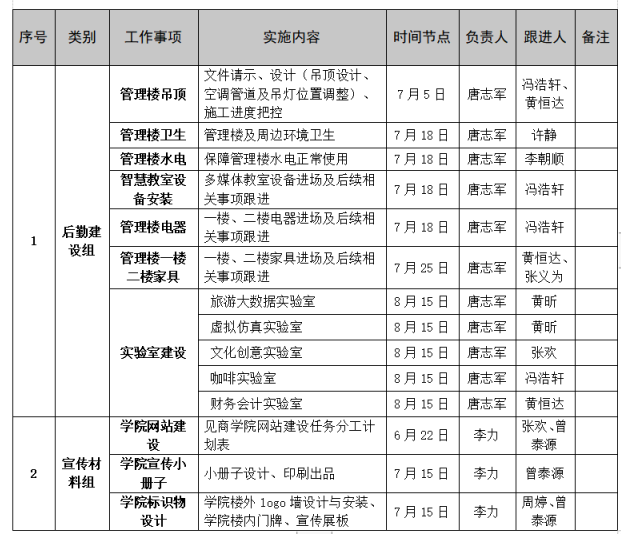 目前正处于学院建设的非常时期,需要各位老师的团结协作。学院将各位老师分为后勤建设组与宣传材料组两个小组,请仔细阅读下表充分了解分工情况。从第16周开始,各项工作跟进人需每周向组长汇报两次工作推进情况,以确保工作最后按时间节点完成。目前较为紧急的是商学院网站建设工作,具体各项工作分工见商学院网站建设任务分工计划表,请各项工作负责老师在6月22日前完成资料收集。