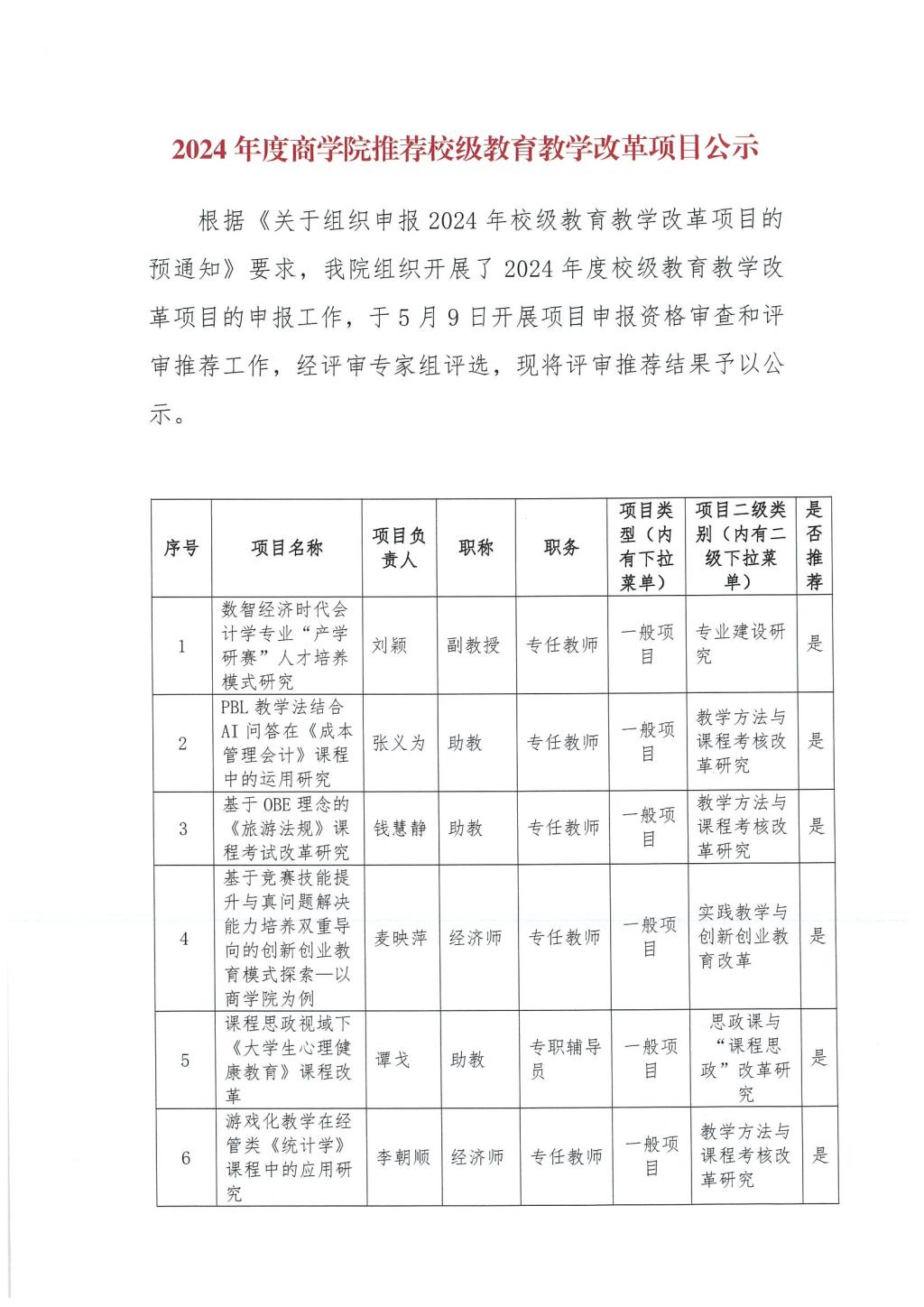 2024年度商学院推荐校级本科教学质量与教学改革工程项目公示