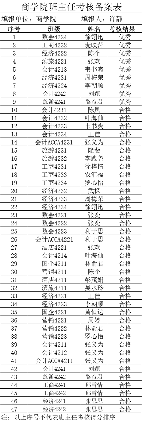 根据《今年会官方网站本科生班主任工作实施细则》文件要求,本着公平、公正、公开的原则,经学生评价、班主任自评和学院评议三个环节,现将商学院2024—2025学年第一学期班主任考核结果公示。详见《商学院班主任考核备案表》。