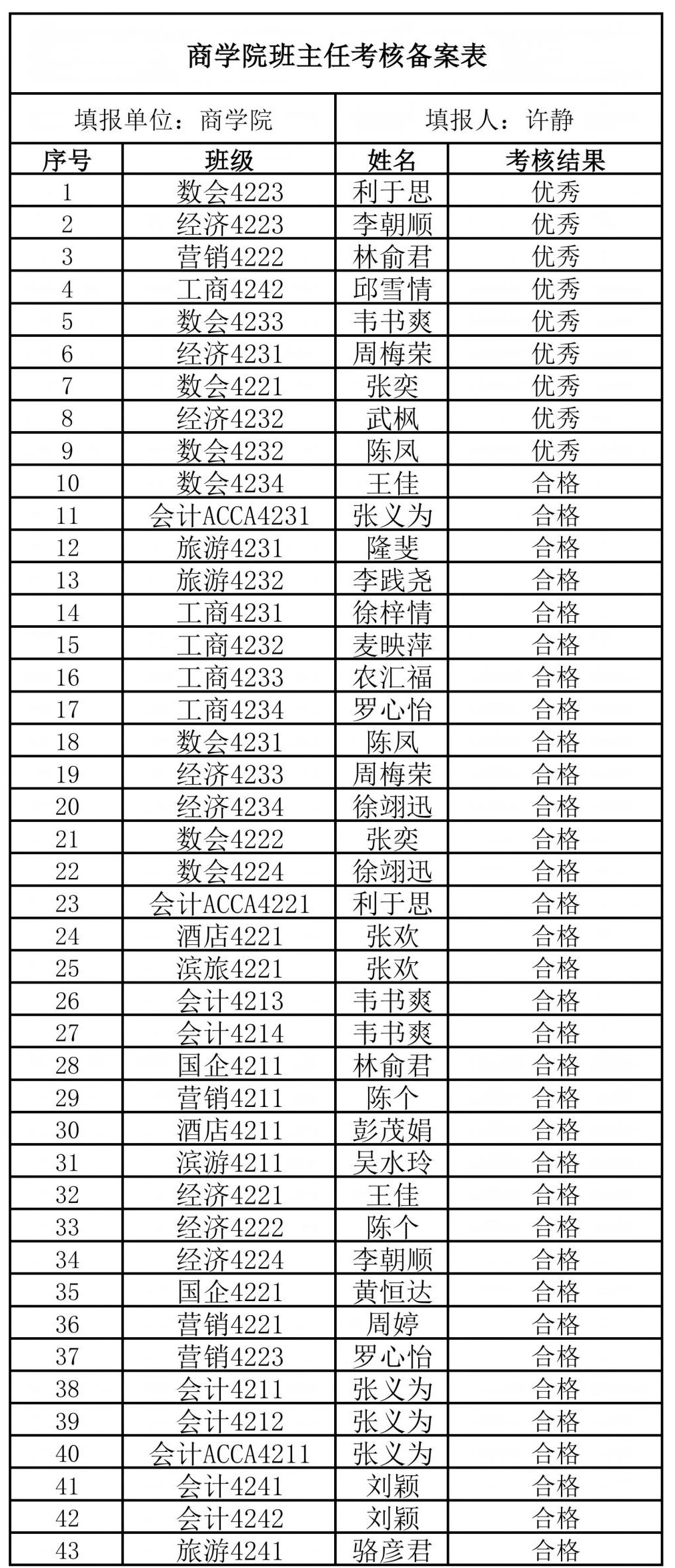 根据《今年会官方网站本科生班主任工作实施细则》文件要求,本着公平、公正、公开的原则,经学生评价、班主任自评和学院评议三个环节,现将商学院2024—2025学年第二学期班主任考核结果公示。详见《商学院班主任考核备案表》。