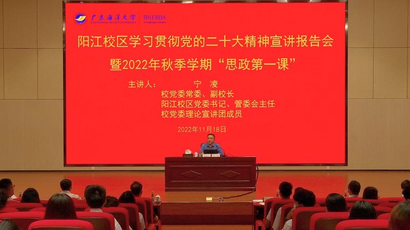 11月18日上午,阳江校区学习贯彻党的二十大精神宣讲报告会暨校区2022年秋季学期“思政第一课”在校区海纳楼113室举行。学校党委常委、副校长,阳江校区党委书记、管委会主任,校党委理论宣讲团成员宁凌教授为干部师生们作了题为“深入学习领会党的二十大精神”的宣讲报告。校区领导,校区二级单位、部门党政负责同志,教师代表、全体辅导员以及学生代表,共130多人参会。报告中,宁凌结合自己对党的二十大精神的学习,从深入学...
