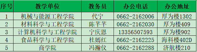 电话:0662-2162001(综合事务)、2162721(组织人事)、2162085(教学科研)、2162136(学生事务)、2162163(后勤服务)、2162096(资产财务)