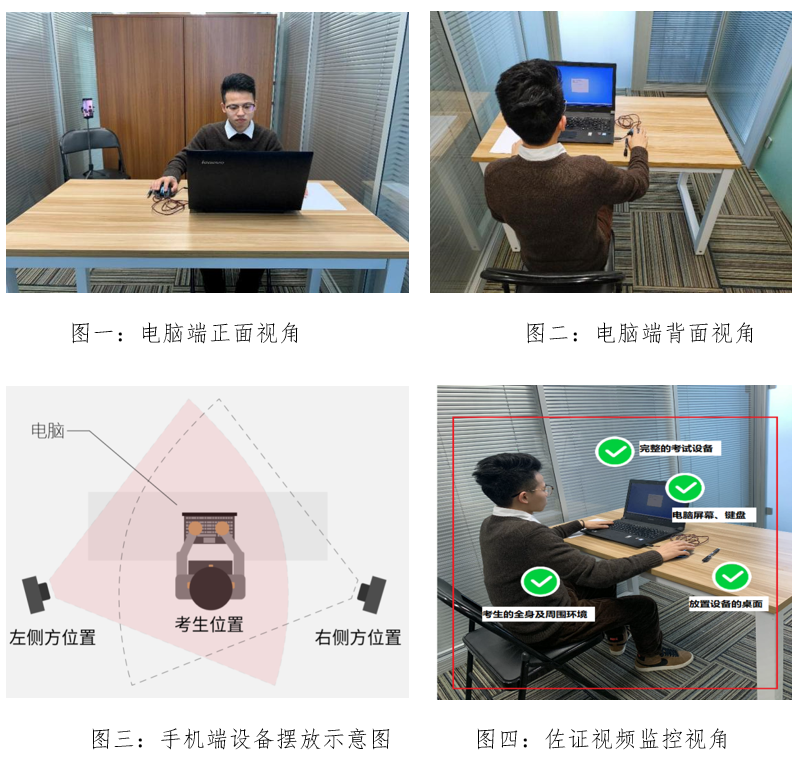 3.进入考试页面前,考生需要先登录移动端“智试通”,用前置摄像头360o环绕拍摄考试环境,随后将移动设备固定在能够清晰拍摄到考生桌面、考生电脑桌面、周围环境及考生行为的位置上继续拍摄,拍摄角度无法覆盖监控内容或画面不清晰等将影响成绩有效性。